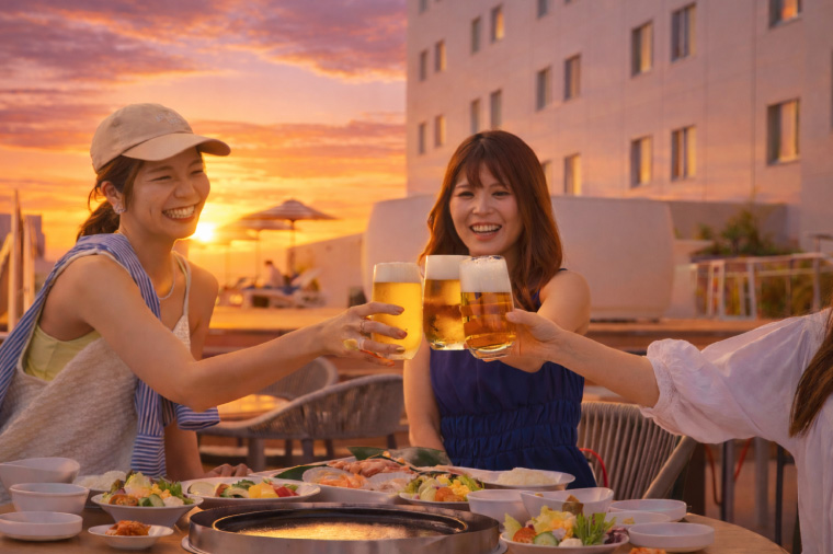 インフィニティープールに隣接しているバーベキューテラスは、都会の中にありながらもリゾート気分を楽しめるダイニング。夕暮れ空から星空の移ろい、心地よい風に包まれて開放的な食の時間を。
